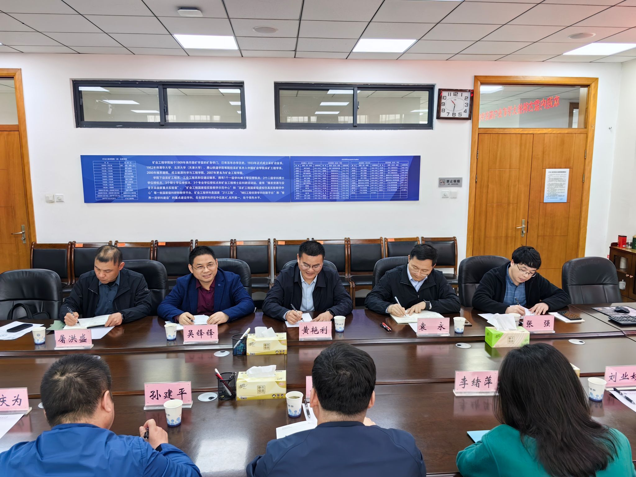 院长黄艳利、副院长袁永、采矿工程系支部书记吴锋锋、智能采矿工程系副主任张强、学科建设办公室副主任屠洪盛进行关于采矿工程学科、智能采矿专业的建设与发展交流。