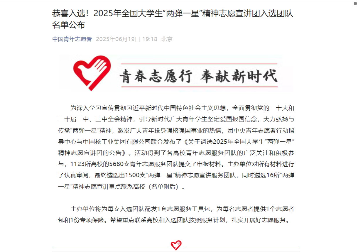 为深入学习宣传贯彻习近平新时代中国特色社会主义思想,全面贯彻党的二十大和二十届二中、三中全会精神,引导新时代广大青年学生坚定爱国报国信念,大力弘扬与传承“两弹一星”精神,激发广大青年投身强核强国事业的热情,团中央青年志愿者行动指导中心与中国核工业集团有限公司联合发布了《关于遴选2025年全国大学生“两弹一星”精神志愿宣讲团的公告》。活动得到了各高校青年志愿服务团队的广泛关注和积极参与,1123所高校的5680支青年志愿服务团队提交了申报材料。主办单位对所有材料进行了认真审阅,最终遴选出1500支“两弹一星”精神志愿宣讲服务团队,同时遴选16所“两弹一星”精神志愿宣讲重点联系高校。我校新葡京网址