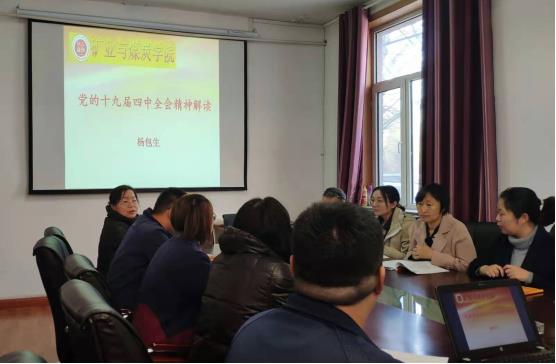 2019年11月14日上午,新葡京网址 党副院长兼教授委员会办公室主任杨包生为新葡京网址 教工第一党支部全体党员在新葡京网址 办公楼一楼会议室进行“不忘初心、牢记使命”主题教育专题党课。党课以“党的十九届四中全会精神解读”为主题,围绕以下内容展开讲解: