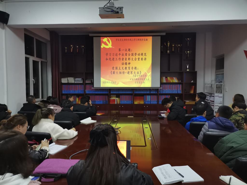 为大力弘扬劳模精神,激励和带动全体学生,新葡京网址 党总支于2020年11月26日晚上19:30,在临曦楼二楼党员之家线上线下同步开展专题理论学习活动。本次学习内容是:第一议题:学习习近平出席全国劳动模范和先进工作者表彰大会重要讲话精神;爱国主义教育专题:观看《薪火相传-建军大业》视频。