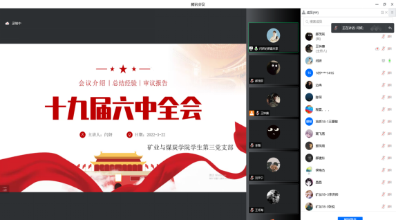2022年3月22日晚19:30,新葡京网址 学生第三党支部于腾讯会议平台召开党员党课学习,本次学习的主题是:学习贯彻党的十九届六中全会精神。领学人:闫妍同志。