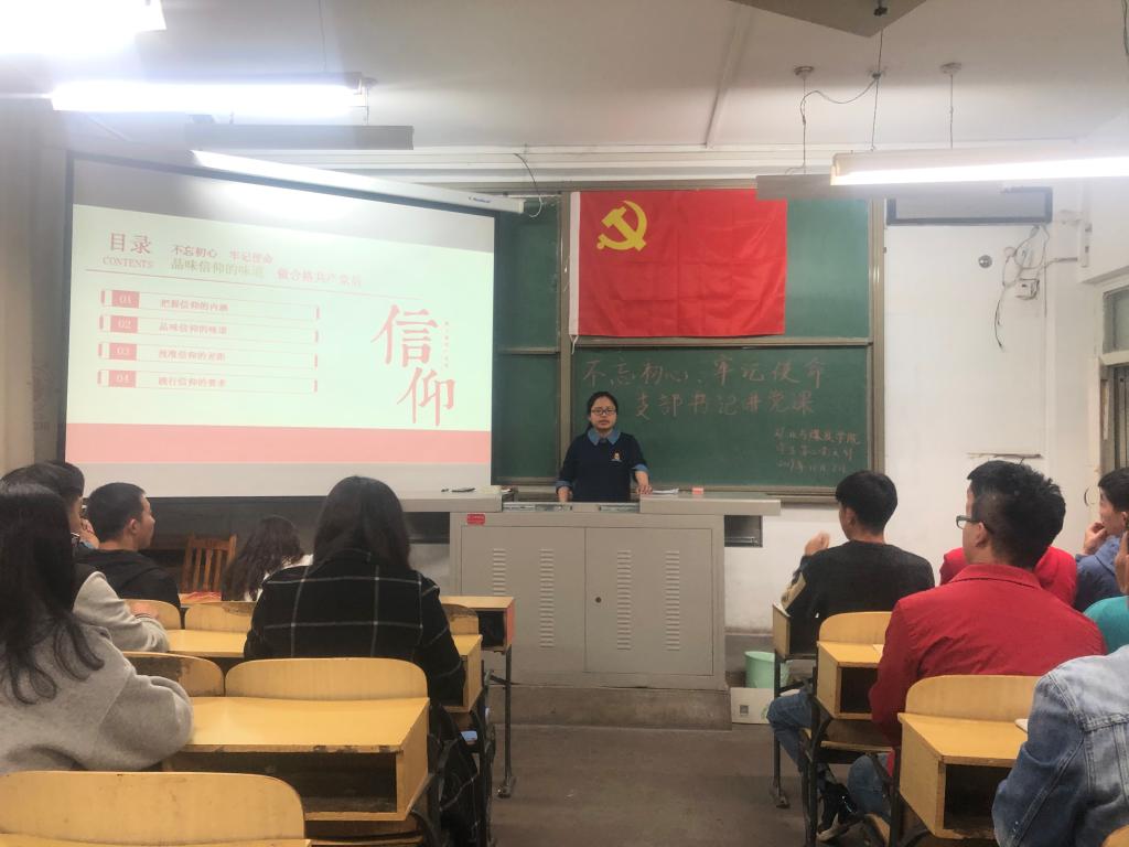 首先,俞文琳同志向到会党员讲解了学生党员和学生干部在思想和信仰引领方面的重要意义。接着,俞文琳同志围绕着“把握信仰的内涵”、“品味信仰的味道”、“找准信仰的差距”、“践行信仰的要求”四部分内容展开讲解。最后,俞文琳同志向各位党员同志强调:只有心中有信仰,脚下才会有力量。