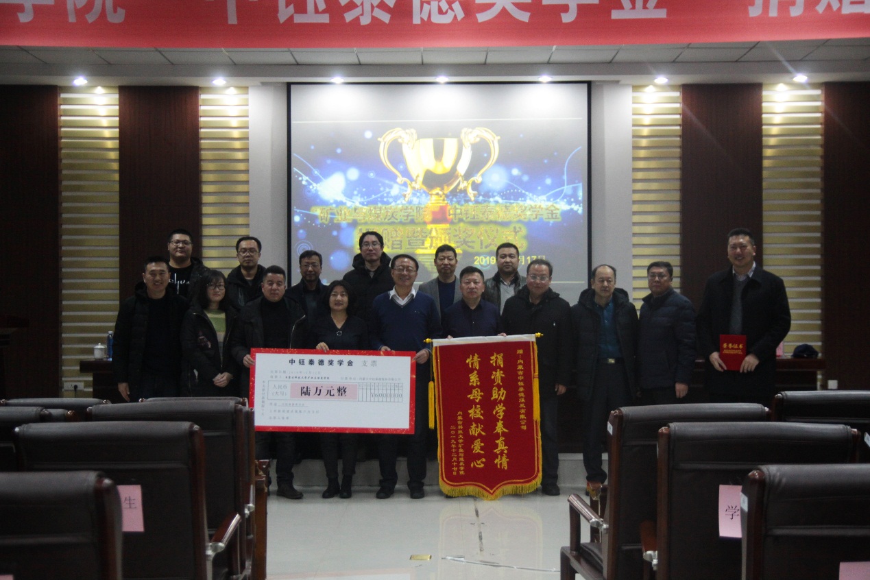 向公司表示谢意并回赠了荣誉证书与锦旗。杨包生副院长宣读了本次24名获奖学生名单,并与王书记、杜书记和公司代表一起为获奖学生颁发了获奖证书。王军董事长一直以来都心系母校,情系学生。这份奖学金不仅可以缓解他们在生活中的经济困难,更重要的是让他们感受到来自社会的关心与帮助,同时也希望通过这样的活动和行为,能够带动全社会都来关心教育事业,关爱困难家庭,以正能量来唤起年轻一代大学生不忘初心,刻苦学习,提高自身的综合素质,并将这份爱心传递下去。同时获奖学生刘运超代表所有获奖的同学上台发言,表达了对中钰泰德公司的感谢,与同学们分享了他的学习经历和获奖感受,并表示在今后会用自己小小的力量,影响、帮助身边的同学。