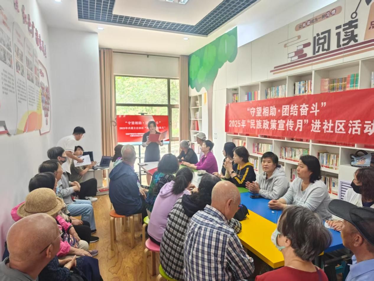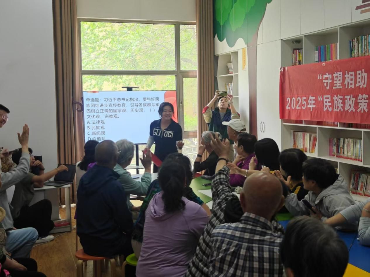 活动伊始,青年研习社成员通过精心设计的有奖问答环节,围绕《民族政策与法治思想》、《国家通用语言文字法》、《内蒙古自治区促进民族团结进步条例》等核心法规政策,与社区居民展开互动。现场气氛热烈,居民们踊跃抢答,在轻松愉快的氛围中深化了对民族政策的理解。
