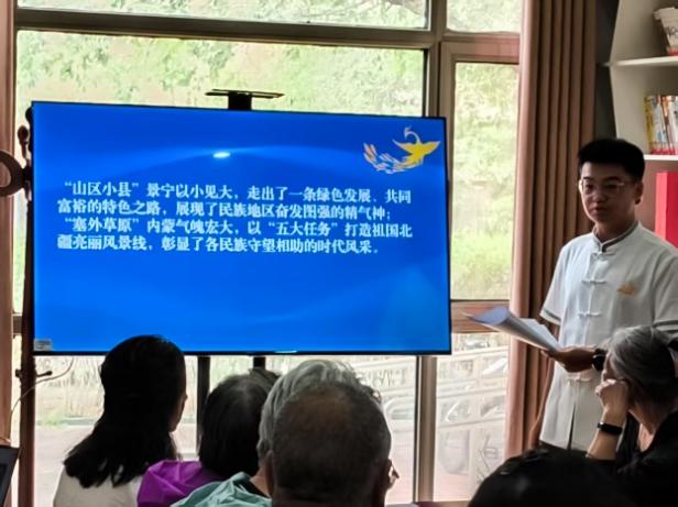 之后,青年研习社成员叶奕成以“畲乡情深绘同心·民族团结谱新篇”为题,进行了主题宣讲。他生动分享了浙江省景宁畲族自治县将高质量发展与民族团结深度融合的实践案例——“景宁样本”,展现了民族地区发展的“中国智慧”,让在场居民对于民族政策有了更深的了解。