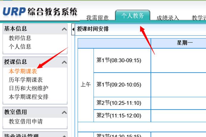 2、点击个人教务,点击本学期课表。